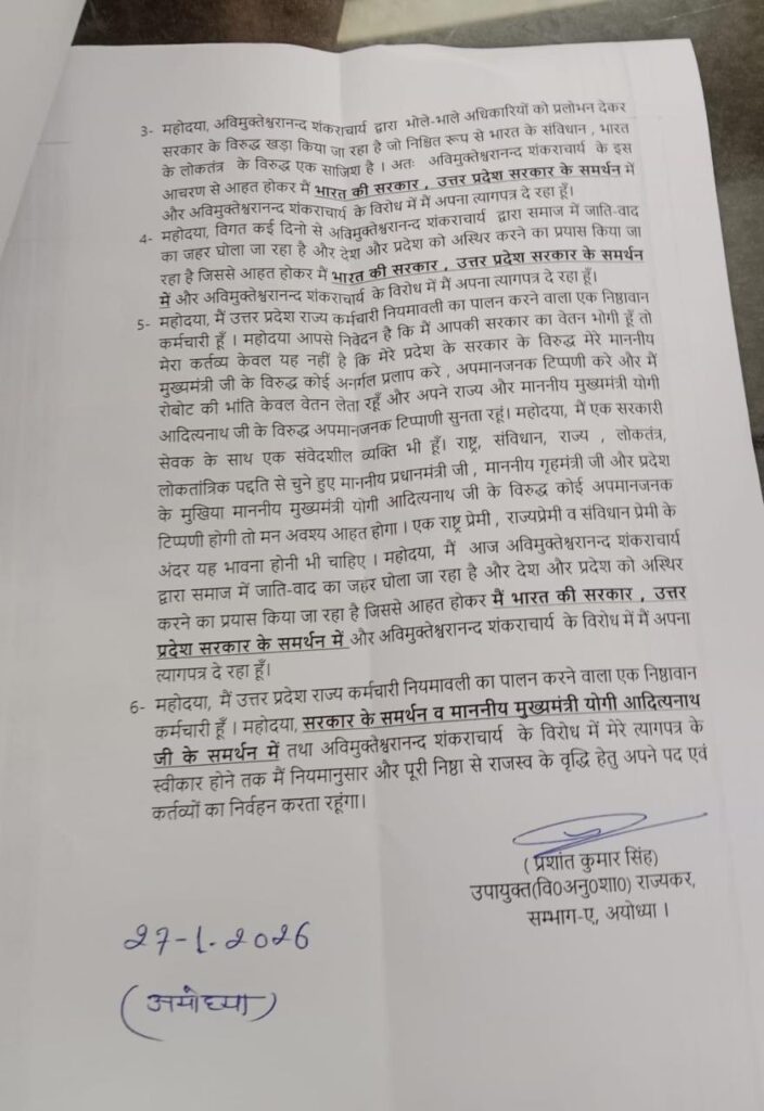 अयोध्या । अयोध्या GST उपायुक्त इस्तीफा मामले ने उत्तर प्रदेश की राजनीति और प्रशासनिक हलकों में हलचल तेज कर दी है। स्वामी अविमुक्तेश्वरानंद से जुड़े विवाद के बीच अब ब्यूरोक्रेसी भी खुलकर सामने आ गई है। अयोध्या के GST उपायुक्त प्रशांत कुमार सिंह ने मुख्यमंत्री योगी आदित्यनाथ के समर्थन में अपने पद से इस्तीफा दे दिया है।