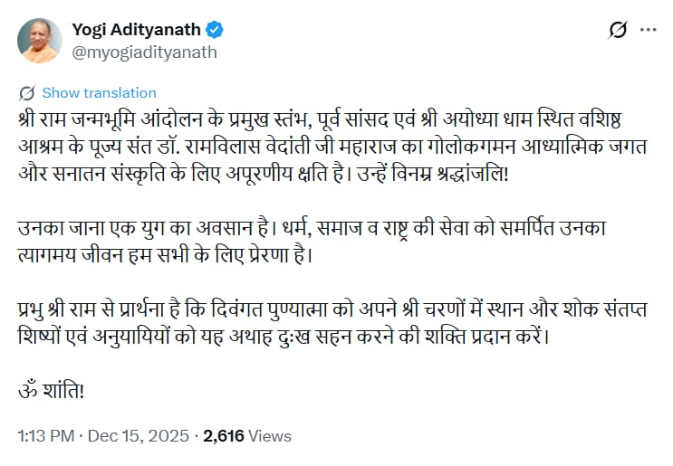 “पूज्य संत डॉ. रामविलास वेदांती का निधन सनातन संस्कृति के लिए अपूरणीय क्षति है। उनका जाना एक युग का अंत है। धर्म, समाज और राष्ट्र को समर्पित उनका जीवन हम सभी के लिए प्रेरणास्रोत है।”