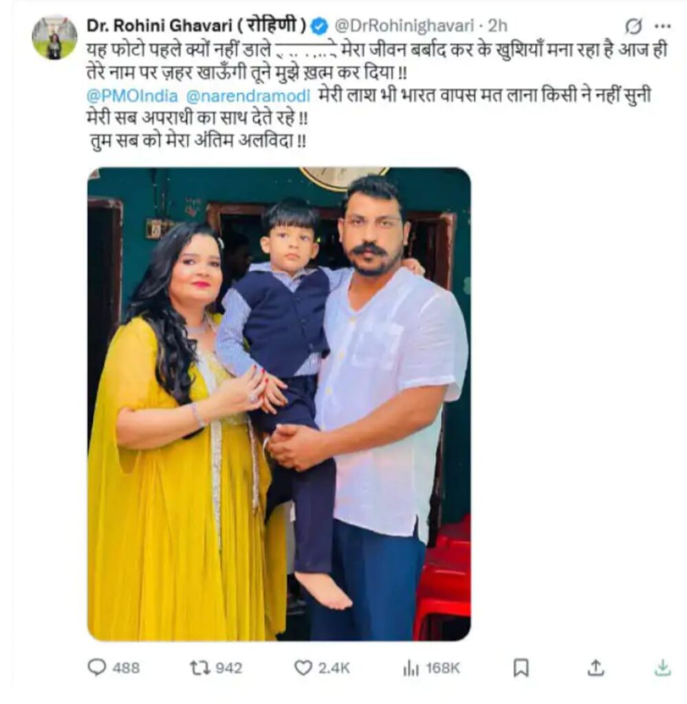 पहली पोस्ट में उन्होंने एक पुरानी तस्वीर साझा की, जिसमें चंद्रशेखर उनके माता-पिता के साथ दिखाई दे रहे हैं। रोहिणी ने लिखा कि उनके परिवार ने सांसद को सम्मान दिया, उनके हाथों का खाना खिलाया, लेकिन अब उन्हें धमकाया जा रहा है।