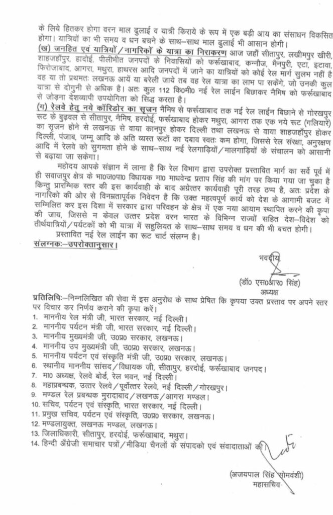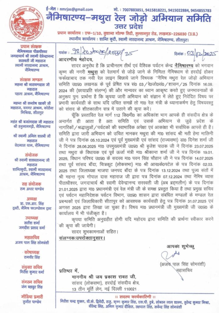 नैमिषारण्य–मथुरा रेल जोड़ो अभियान को लेकर समिति ने प्रधानमंत्री, रेल मंत्री और मुख्यमंत्री को 112 किमी नई रेल लाइन बिछाने का विस्तृत प्रस्ताव भेजा है। सीतापुर-हरदोई-फर्रुखाबाद के माध्यम से मथुरा को जोड़ने वाला यह मार्ग तीर्थ पर्यटन के लिए बेहद अहम माना जा रहा है।