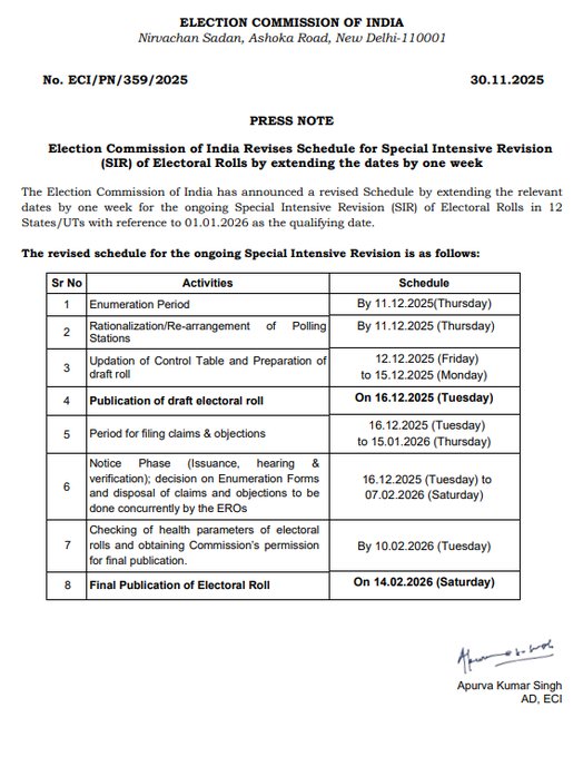 UP SIR समय सीमा बढ़ी—चुनाव आयोग ने फॉर्म जमा करने की तारीख 11 दिसंबर तक बढ़ाई। काम के दबाव में यूपी में 7 BLO की मौत, जिसमें 3 सुसाइड और 4 हार्ट अटैक-हेमरेज शामिल। BLO की सैलरी भी बढ़ाई गई।
