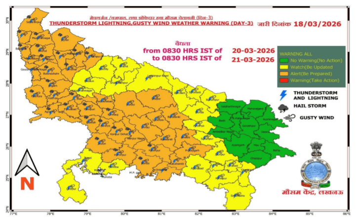 “UP Weather Update Navratri 2026: नवरात्र के साथ उत्तर प्रदेश में मौसम बदल गया है। अगले 72 घंटों में 20 से अधिक जिलों में गरज-चमक, ओलावृष्टि और बारिश का अलर्ट जारी। IMD ने बिजली गिरने की चेतावनी भी दी।“