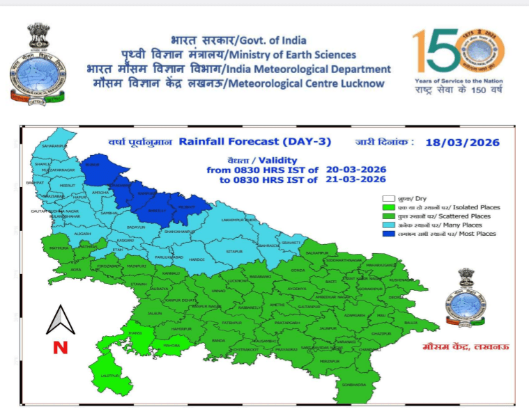 भारतीय मौसम विज्ञान विभाग के अनुसार 19 से 21 मार्च के बीच कई जिलों में हल्की से मध्यम और कहीं-कहीं भारी बारिश हो सकती है। इस दौरान 40 से 50 किमी/घंटा की रफ्तार से तेज हवाएं चलने और ओले गिरने की भी संभावना जताई गई है।