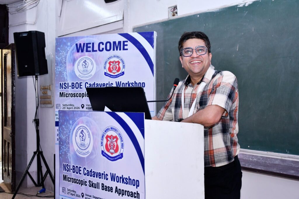 लखनऊ।लखनऊ स्थित किंग जॉर्ज मेडिकल यूनिवर्सिटी (KGMU) एक बार फिर चिकित्सा शिक्षा और प्रशिक्षण के क्षेत्र में नई मिसाल कायम करता नजर आया। 25 अप्रैल 2026 को केजीएमयू के न्यूरोसर्जरी विभाग ने एनाटॉमी विभाग और न्यूरोलॉजिकल सोसाइटी ऑफ इंडिया (NSI) – बोर्ड ऑफ एजुकेशन (BOE) के सहयोग से “माइक्रोसकॉपिक स्कल बेस एप्रोच ” विषय पर एक उच्च स्तरीय कैडावरिक वर्कशॉप का सफल आयोजन किया। इस कार्यशाला ने न केवल प्रदेश बल्कि देशभर के चिकित्सा विशेषज्ञों को उन्नत सर्जिकल तकनीकों का व्यावहारिक अनुभव प्रदान किया।