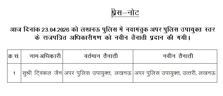 जारी आदेश के अनुसार, सुश्री ट्विंकल जैन को अपर पुलिस उपायुक्त, उत्तरी लखनऊ के पद की जिम्मेदारी सौंपी गई है। वह इससे पहले भी लखनऊ पुलिस में अपर पुलिस उपायुक्त के रूप में कार्यरत थीं और प्रशासनिक अनुभव रखने वाली अधिकारियों में शामिल मानी जाती हैं।
