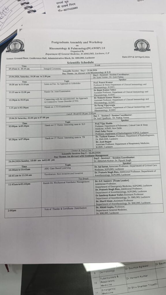 “डॉ राम मनोहर लोहिया आयुर्विज्ञान संस्थान में रूमेटोलॉजी, पल्मोनोलॉजी, TB और क्रिटिकल केयर पर दो दिवसीय वर्कशॉप आयोजित हुई, जिसमें AIIMS, SGPGI और KGMU के विशेषज्ञ शामिल हुए।“