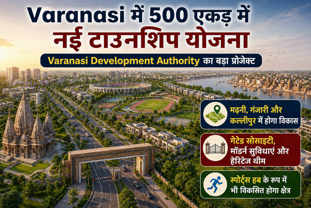 “Varanasi New Township Project: वाराणसी में VDA 500 एकड़ में 3 नई टाउनशिप विकसित करेगा। मढ़नी, गंजारी और कल्लीपुर में आधुनिक सुविधाओं के साथ सस्ते प्लॉट मिलेंगे।“
